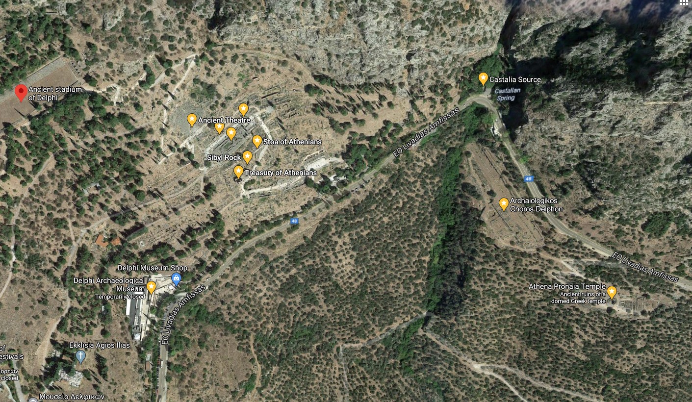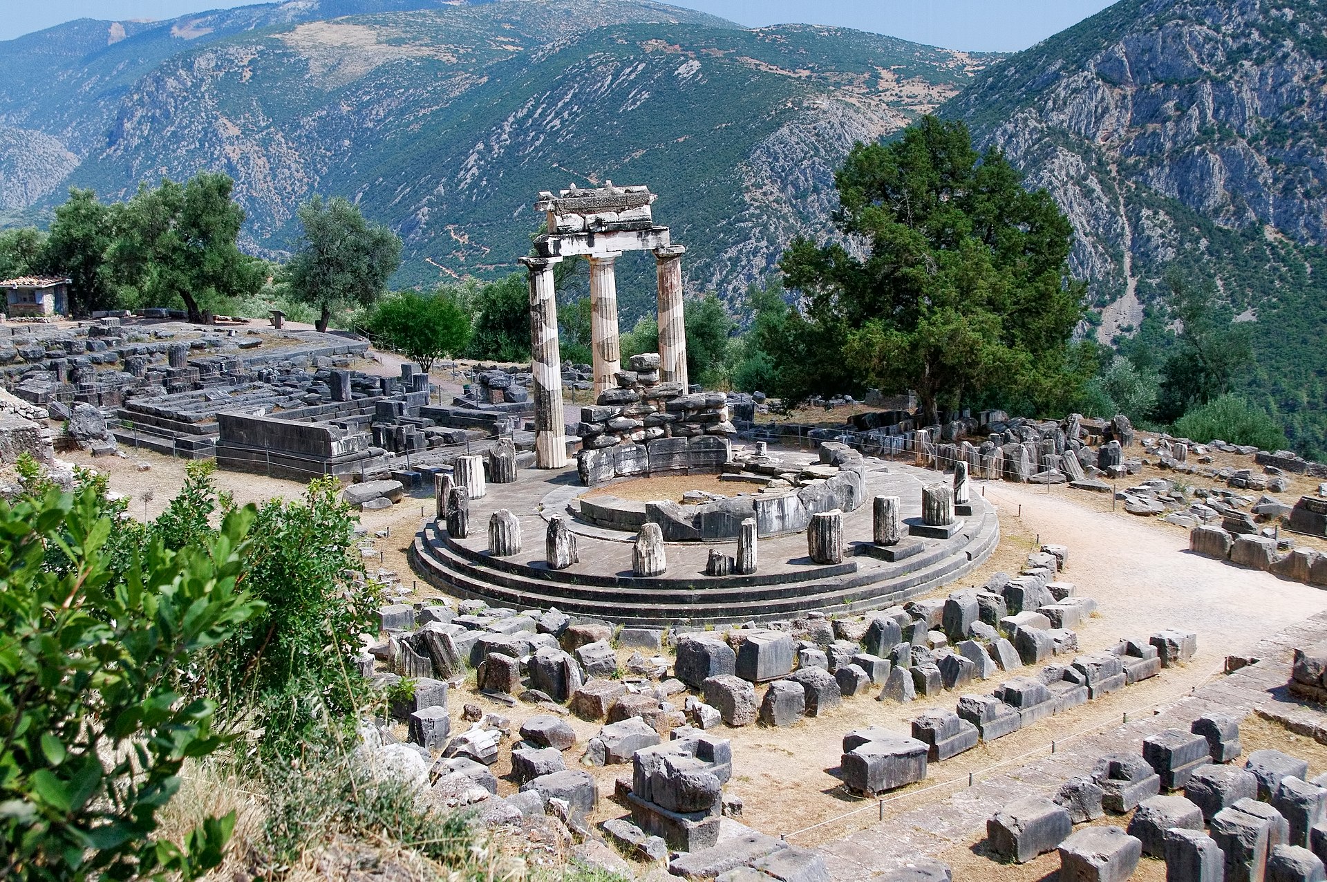 Στους πρόποδες του Παρνασσού, στο υποβλητικό φυσικό τοπίο που σχηματίζεται ανάμεσα σε δύο θεόρατους βράχους, τις Φαιδριάδες, βρίσκεται το πανελλήνιο ιερό των Δελφών και το πιο ξακουστό μαντείο της αρχαίας Ελλάδας. Οι Δελφοί ήταν ο ομφαλός της γης, όπου, σύμφωνα με τη μυθολογία, συναντήθηκαν οι δύο αετοί που έστειλε ο Δίας από τα άκρα του σύμπαντος για να βρει το κέντρο του κόσμου, και για πολλούς αιώνες αποτελούσαν το πνευματικό και θρησκευτικό κέντρο και το σύμβολο της ενότητας του αρχαίου ελληνισμού. Η ιστορία των Δελφών χάνεται στην προϊστορία και στους μύθους των αρχαίων Ελλήνων. Σύμφωνα με την παράδοση, εδώ αρχικά υπήρχε ιερό αφιερωμένο στη γυναικεία θεότητα της Γης, και φύλακάς του ήταν ο φοβερός δράκοντας Πύθων. Ο Απόλλωνας σκότωσε τον Πύθωνα και το δικό του ιερό ιδρύθηκε από Κρήτες που έφθασαν στην Κίρρα, το επίνειο των Δελφών, με τη συνοδεία του θεού, μεταμορφωμένου σε δελφίνι. Ο μύθος αυτός σχετικά με την κυριαρχία του Απόλλωνα επιβίωσε σε εορταστικές αναπαραστάσεις που γίνονταν στους Δελφούς, τα Σεπτήρια, τα Δελφίνια, τα Θαργήλεια, τα Θεοφάνεια, και, βέβαια, τα περίφημα Πύθια, που τελούνταν για να θυμίζουν τη νίκη του θεού εναντίον του Πύθωνα και περιελάμβαναν μουσικούς διαγωνισμούς και γυμνικούς αγώνες
